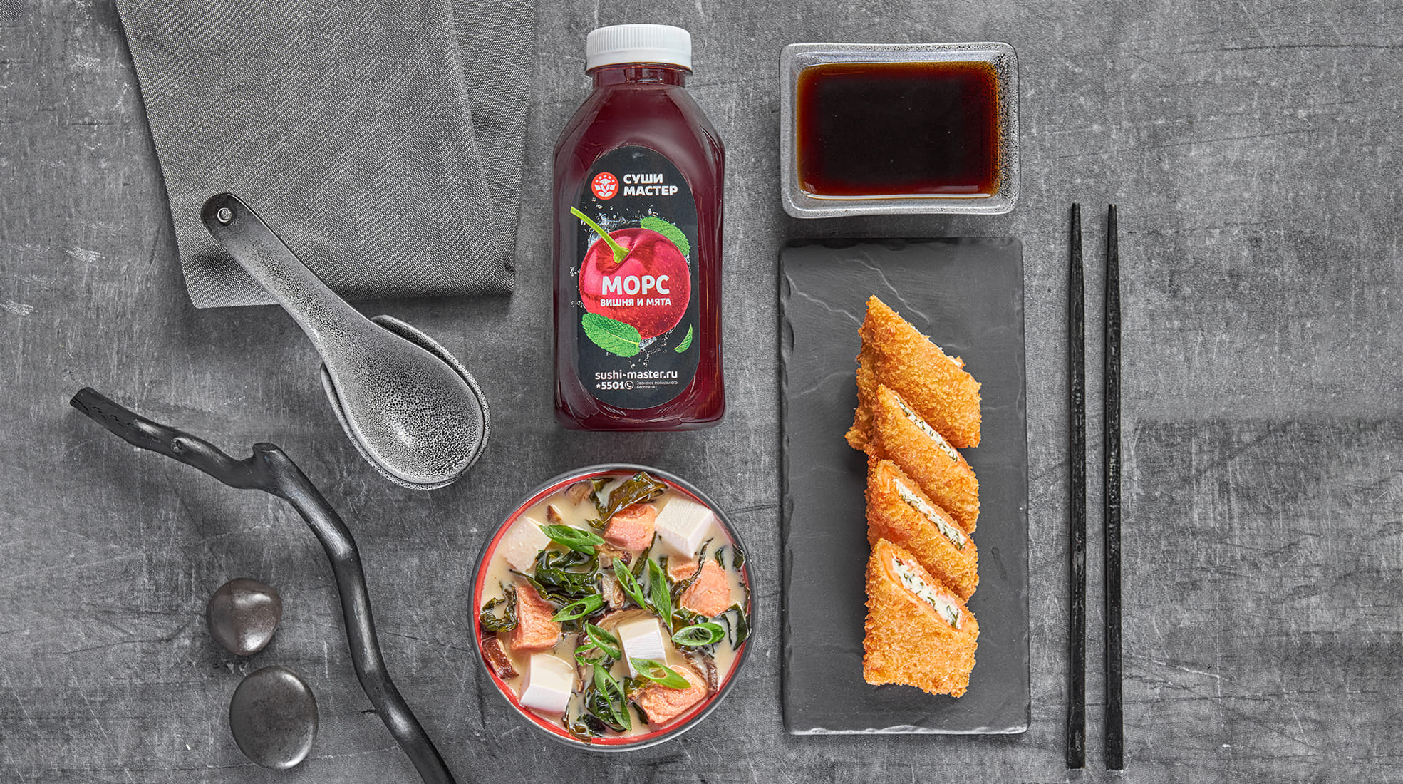 Состав: Мисо суп сливочный с лососем 300гр., Сливочный лосось фри 100гр., Морс вишня-мята 0,5 л. Вес: 400гр./450мл. Соевый соус не входит.