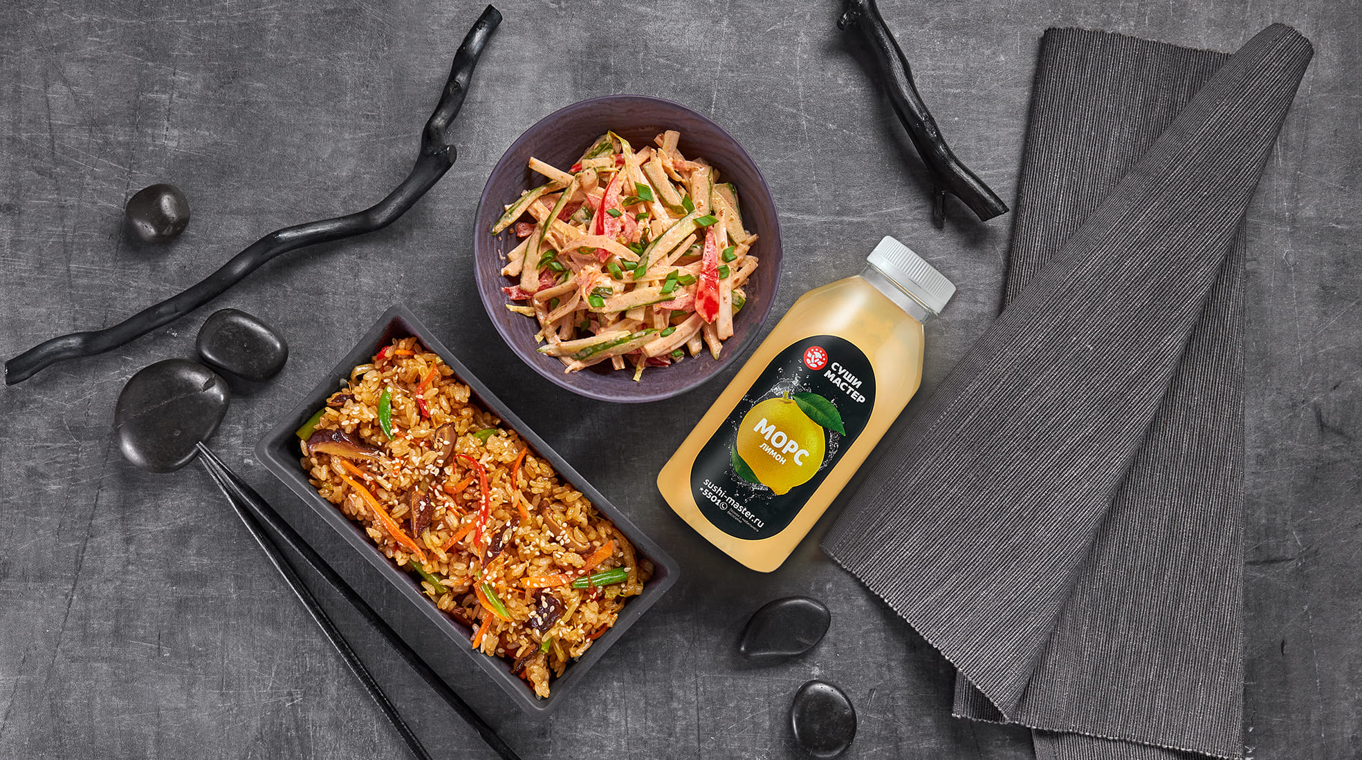 Состав: Рис с овощами 200гр., Острый овощной салат (в составе соус шрирачи) 110гр., Морс лимон. Вес: 310гр/450мл.