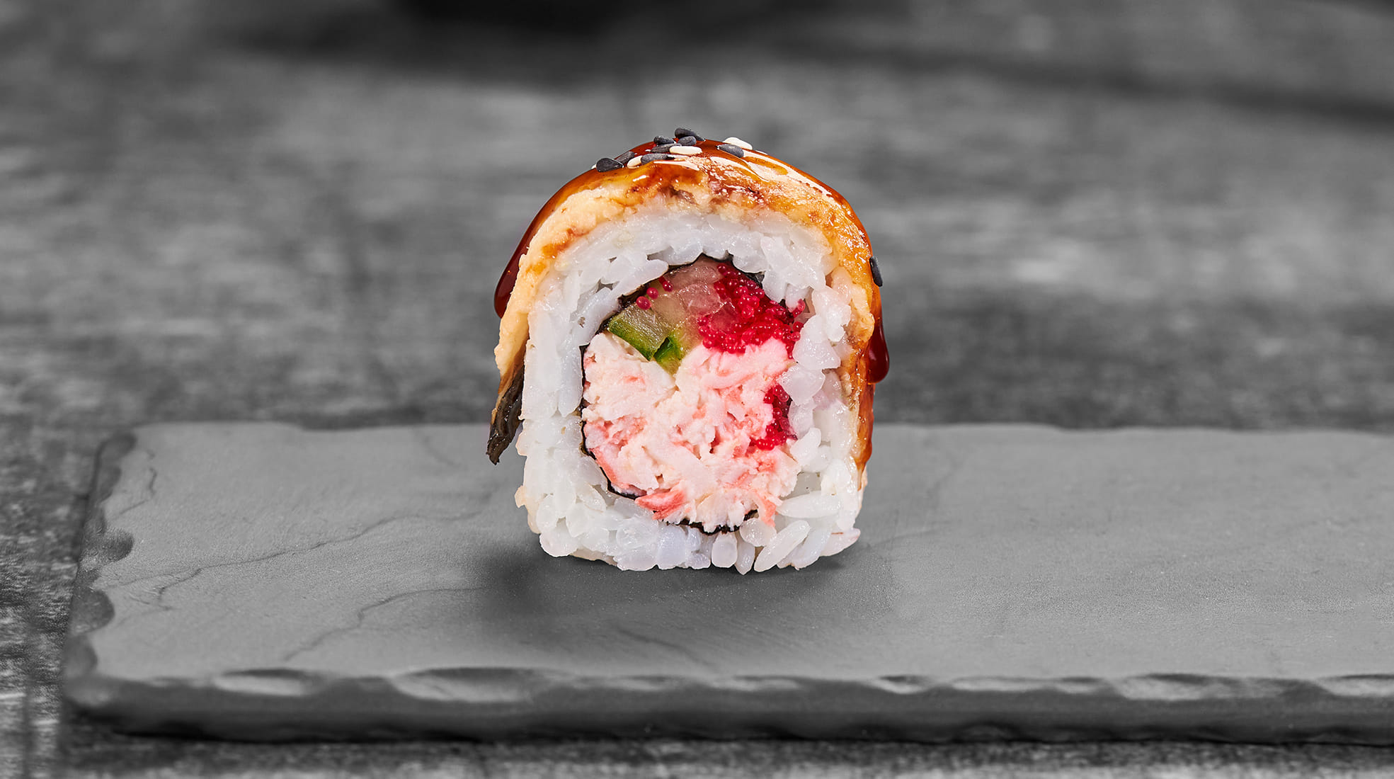 Состав: Замес краб-микс, угорь, икра масаго, огурец. соус унаги, кунжут, рис, нори