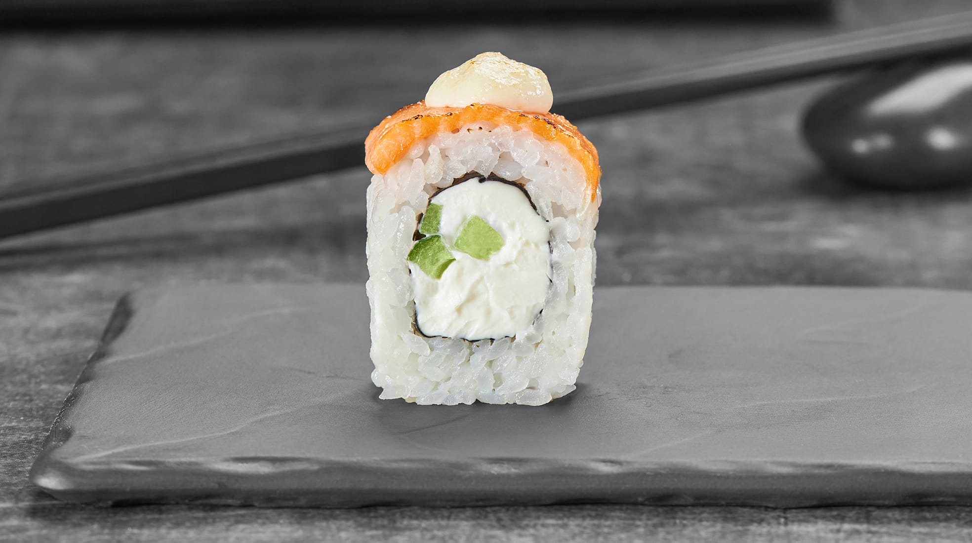 Состав: Лосось, сыр сливочный "Cremette", огурец, замес монако, соус яки, рис, нори