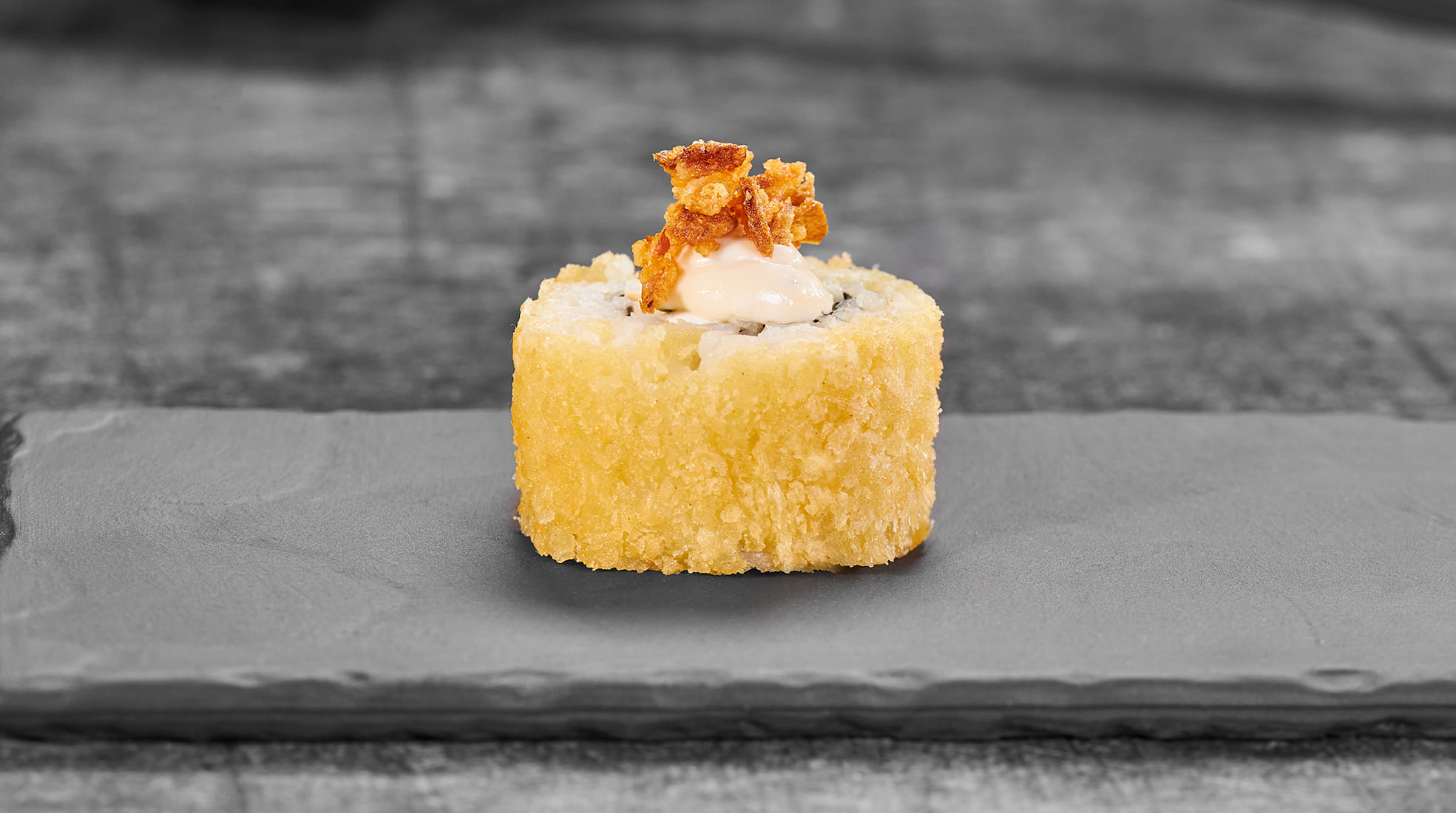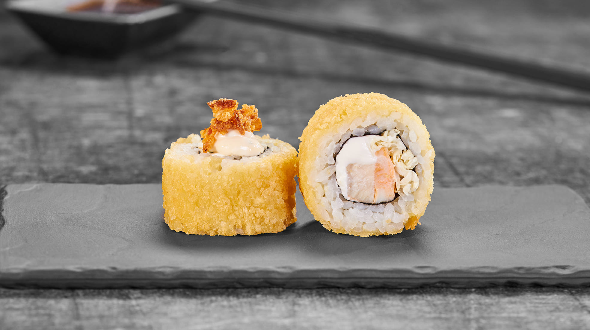 Состав: Курица, сыр сливочный "Cremette", лук фри, соус цезарь, капуста пекинская, кляр, сухари панко, рис, нори