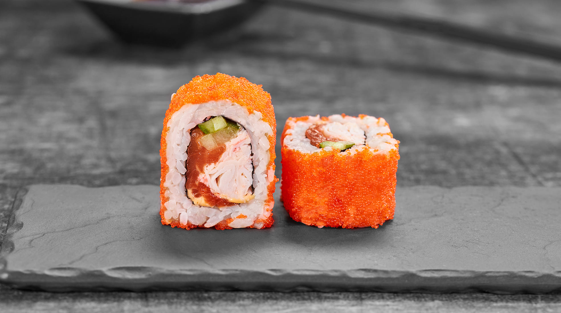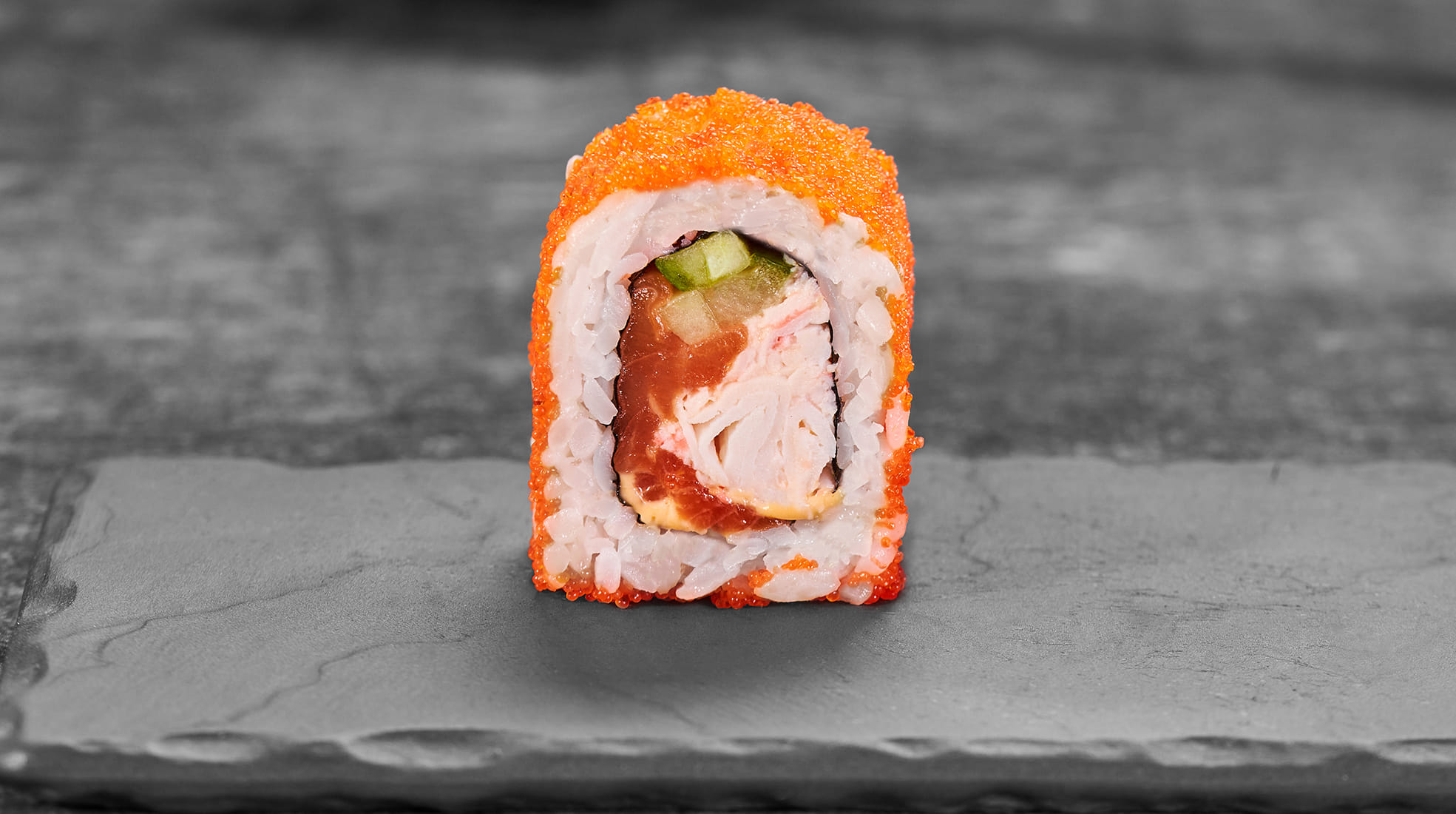Состав: Лосось, замес краб-микс, соус японский майонез, огурец, икра масаго, рис, нори