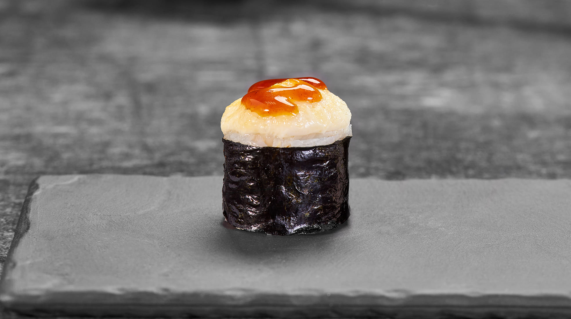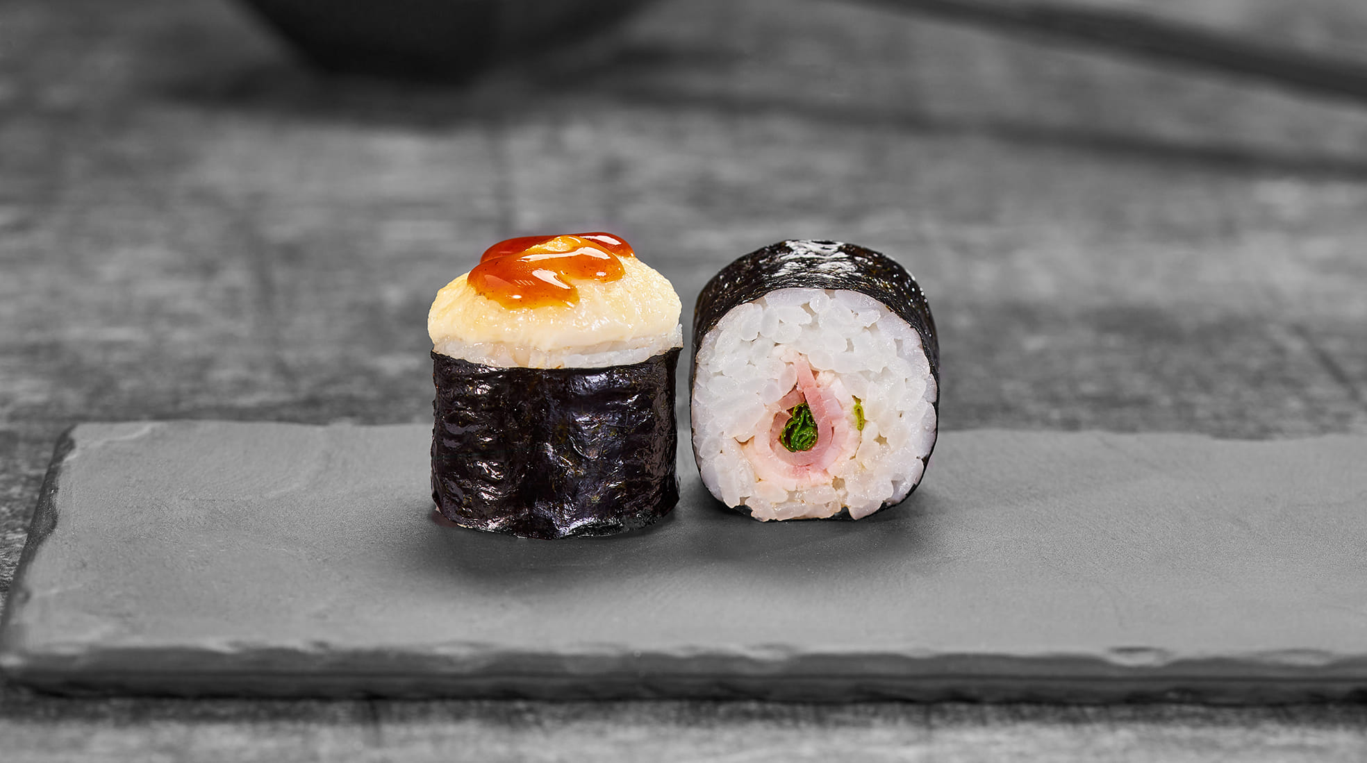 Состав: Бекон, соус спайси, лук зеленый, соус унаги, замес монако, рис, нори